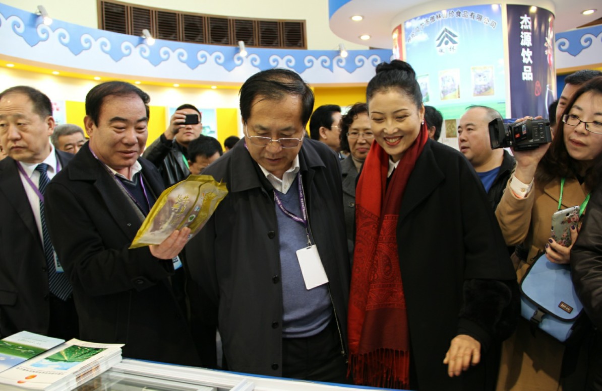 奈倫集團(tuán)副總裁白秋英為王玉明副主席和郭健廳長(zhǎng)介紹參展產(chǎn)品