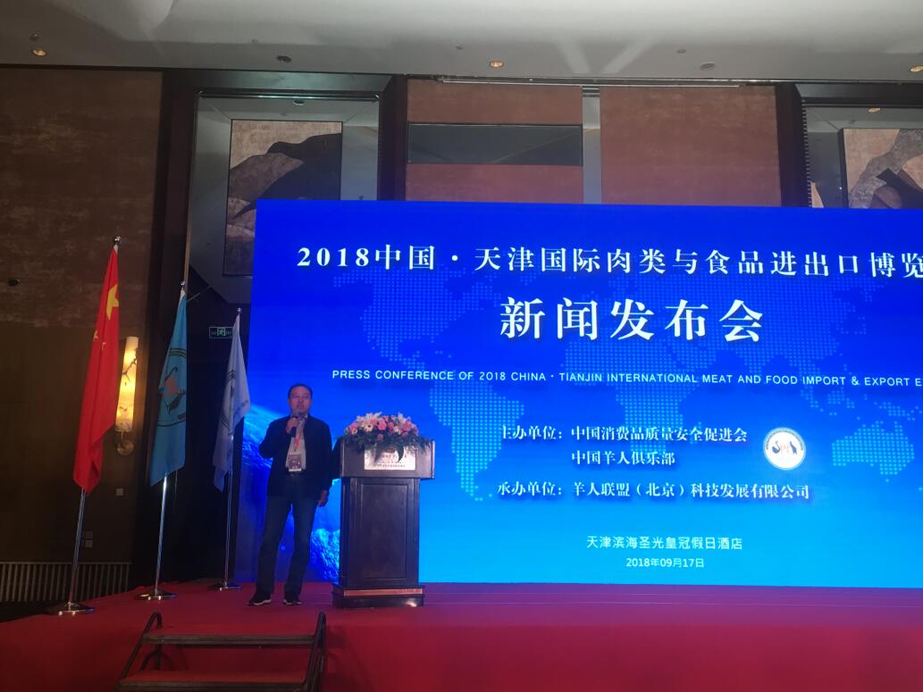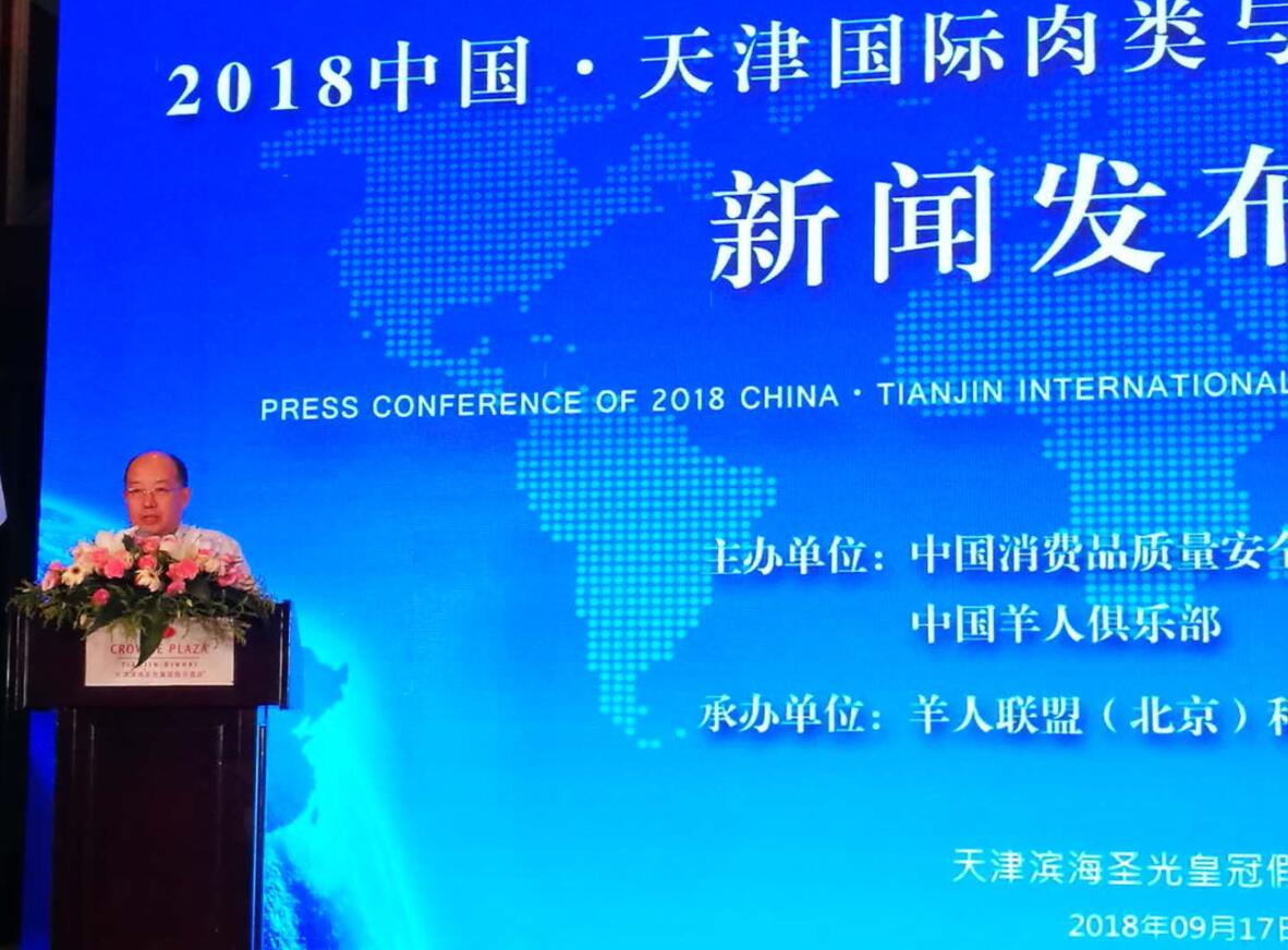 2018年9月17日,“2018天津國際肉類與食品進(jìn)出口博覽會(huì)”新聞發(fā)布會(huì)在天津?yàn)I海圣光皇冠假日酒店召開。中國消費(fèi)品質(zhì)量安全促進(jìn)會(huì)秘書長曾召朋,天津市商務(wù)委員會(huì)副主任劉東水,內(nèi)蒙古農(nóng)牧業(yè)產(chǎn)業(yè)化龍頭企業(yè)協(xié)會(huì)執(zhí)行會(huì)長林永亮,副會(huì)長、內(nèi)蒙古大盛業(yè)羊絨制品有限公司總經(jīng)理魯耀武等相關(guān)負(fù)責(zé)人出席會(huì)議并致辭。