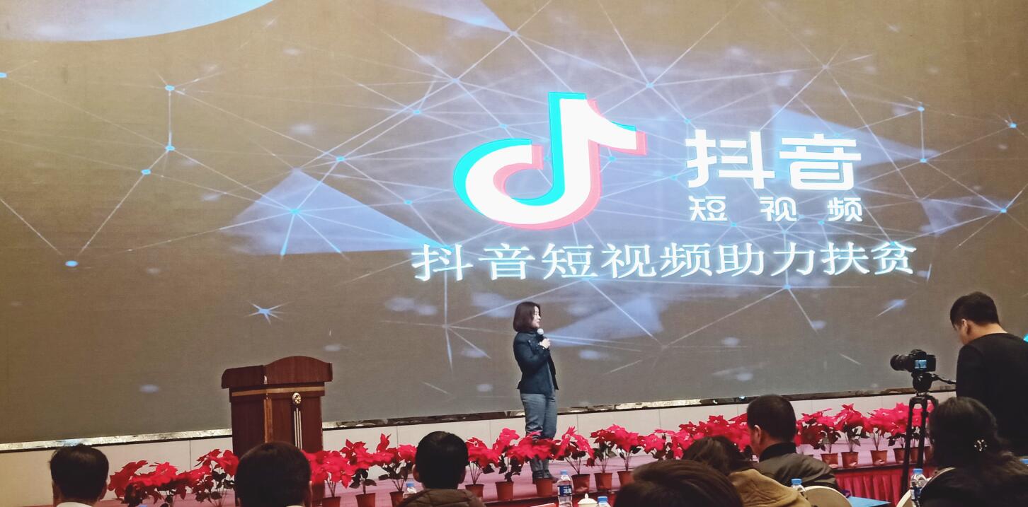 北京字節(jié)跳動科技有限公司政務總監(jiān)杜曉靜通過旗下今日頭條、抖音、火山、西瓜視頻等為與會企業(yè)講解網(wǎng)紅帶貨模式助力產(chǎn)業(yè)扶貧。