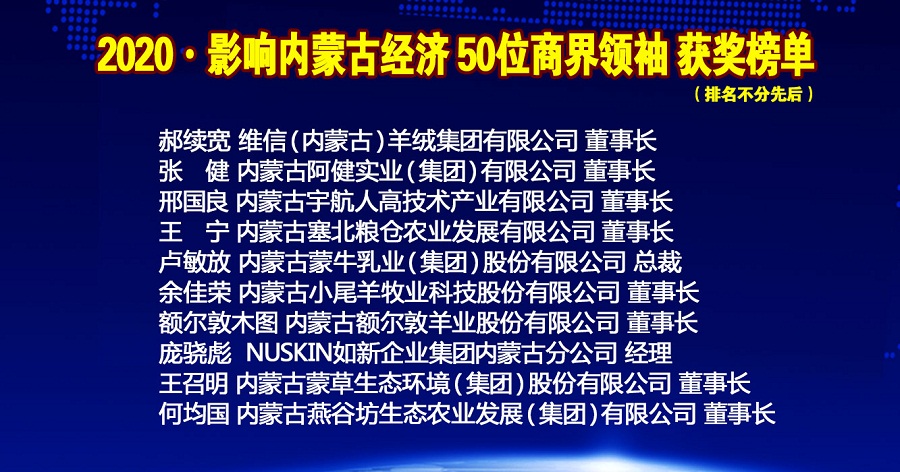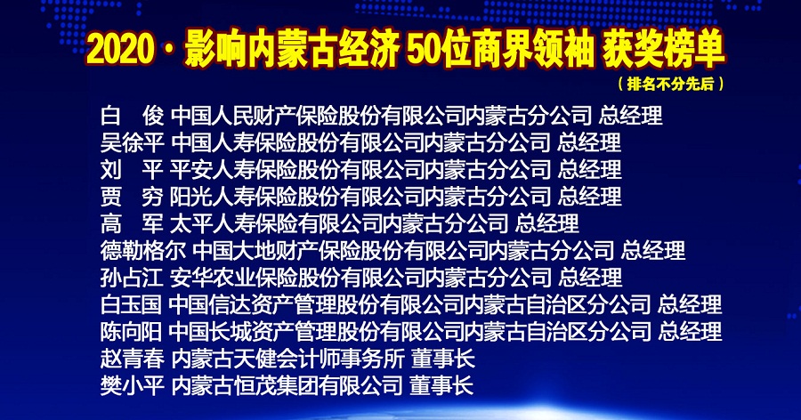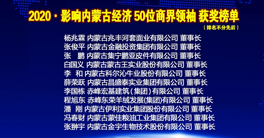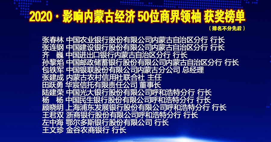 年會(huì)上內(nèi)蒙古金融網(wǎng)、內(nèi)蒙古新金融研究院隆重推出2020•影響內(nèi)蒙古經(jīng)濟(jì)50位商界領(lǐng)袖榜單,從2015年度開(kāi)始,每年按照項(xiàng)目發(fā)展,甄選出當(dāng)年度引領(lǐng)商界風(fēng)潮的50位內(nèi)蒙古最具影響力的商界領(lǐng)袖。