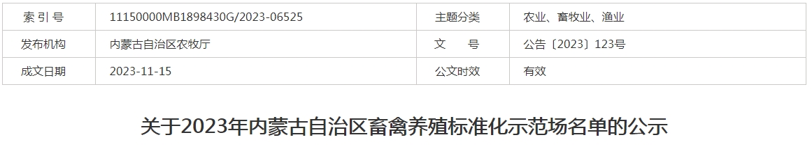 標(biāo)題:關(guān)于2023年內(nèi)蒙古自治區(qū)畜禽養(yǎng)殖標(biāo)準(zhǔn)化示范場(chǎng)名單的公示