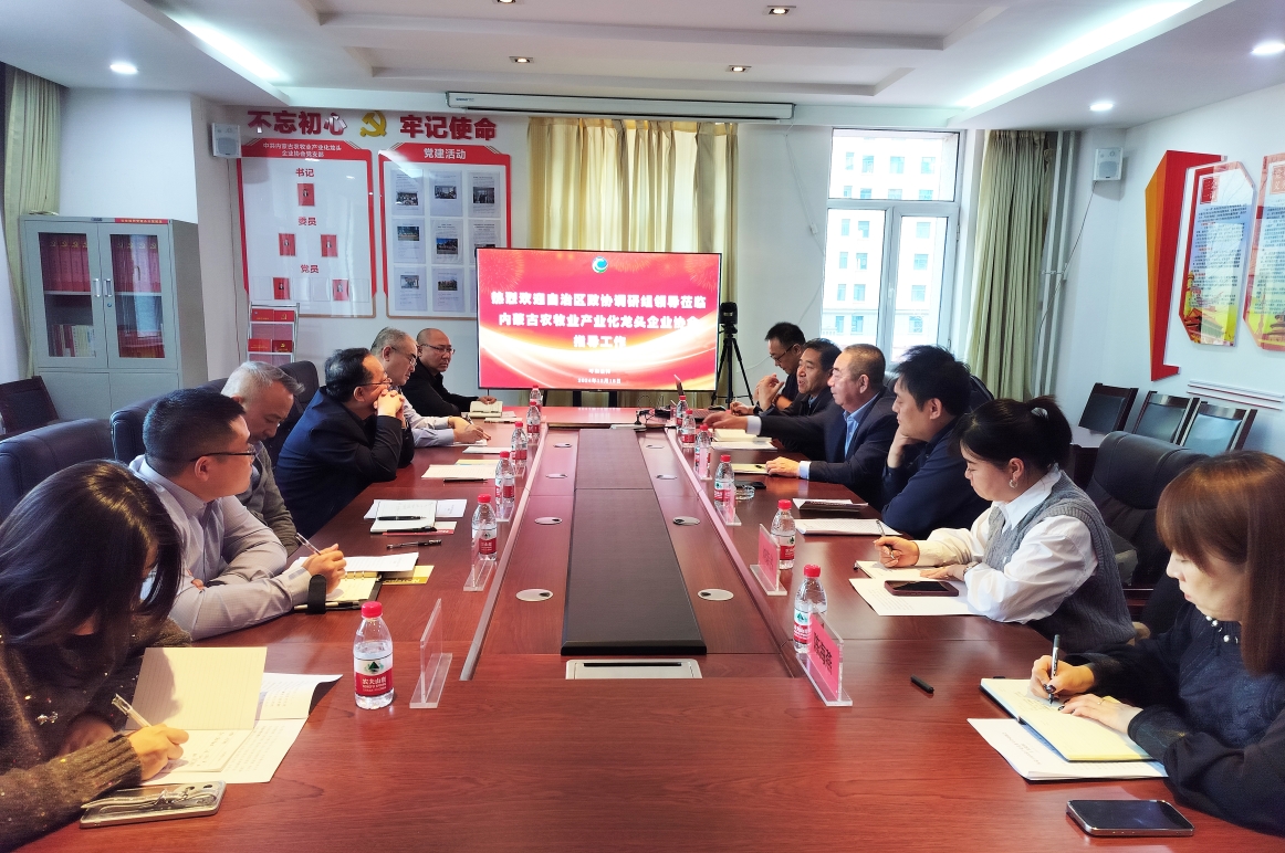 2024年12月18日下午,自治區(qū)政協(xié)委員、港澳臺僑聯(lián)絡(luò)和外事委員會主任張波,內(nèi)蒙古工業(yè)大學(xué)僑聯(lián)副主席新巴雅爾,內(nèi)蒙古航空職業(yè)技術(shù)學(xué)校校長、內(nèi)蒙古航空運(yùn)動協(xié)會會長趙自強(qiáng),自治區(qū)政協(xié)港澳臺僑聯(lián)絡(luò)和外事委員會辦公室主任安勝利一行6人來協(xié)會調(diào)研指導(dǎo)工作,協(xié)會副會長單位內(nèi)蒙古凌志馬鈴薯科技股份有限公司總經(jīng)理閆洪志、內(nèi)蒙古民豐種業(yè)有限公司劉榮書,常務(wù)理事單位內(nèi)蒙古額爾敦羊業(yè)股分有限公司董事長助理畢欣及協(xié)會秘書處全體工作人員參加會議,會議由協(xié)會秘書長呼群主持。