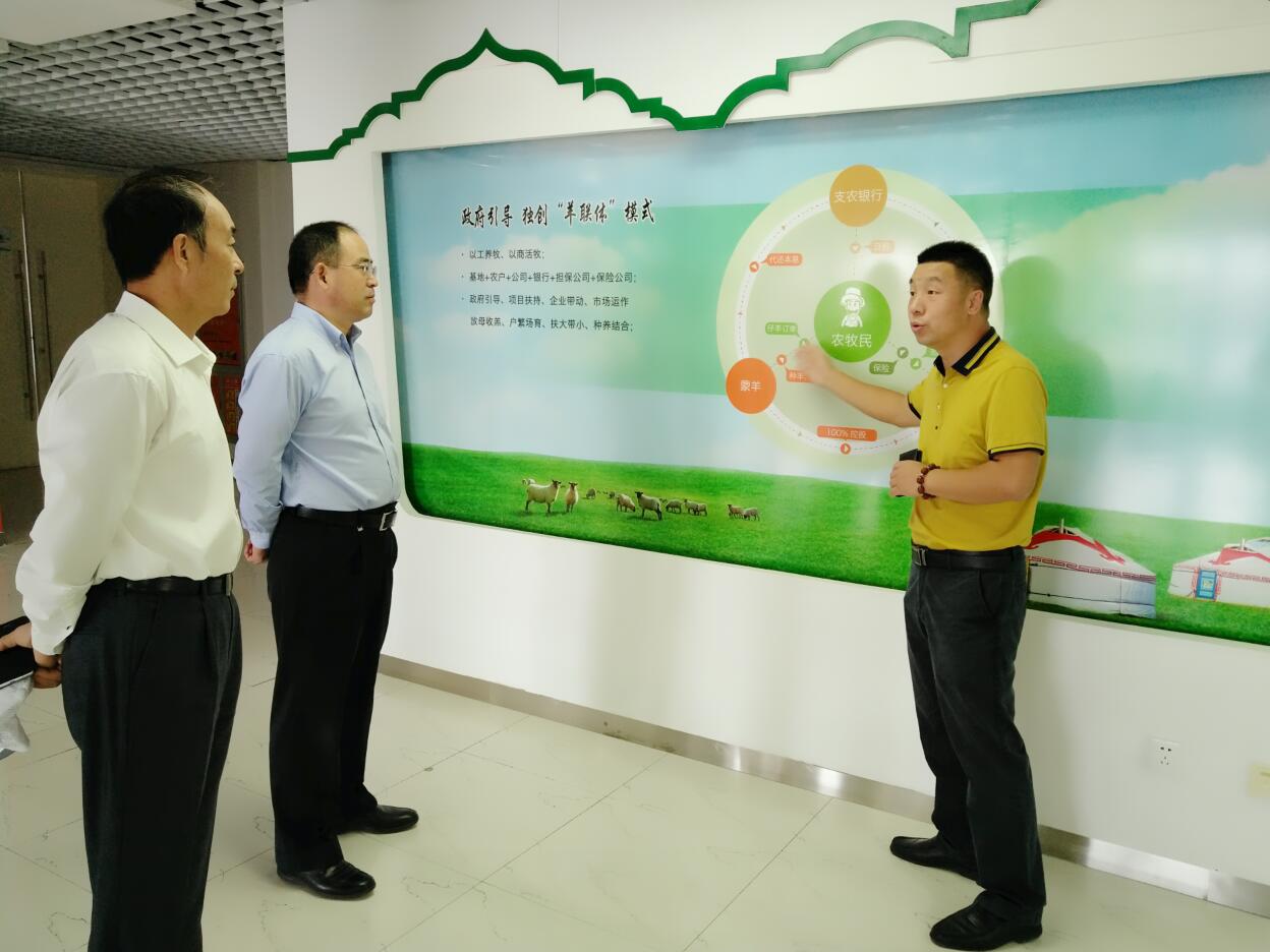 調(diào)研組一行首先參觀協(xié)會會長單位羊牧業(yè)股份有限公司,在聽取協(xié)會會長、蒙羊牧業(yè)副董事長閆樹春的介紹后,調(diào)研組一行詳細(xì)了解了蒙羊的“生產(chǎn)鏈”和“羊聯(lián)體”模式,并指出“羊聯(lián)體”模式是一種很好的模式,企業(yè)發(fā)展帶動農(nóng)牧戶致富,并由企業(yè)出資擔(dān)保農(nóng)牧戶,降低銀行、保險(xiǎn)的風(fēng)險(xiǎn),這種模式既新穎又可控風(fēng)險(xiǎn)。調(diào)研組一行表示,今后銀行等各類金融機(jī)構(gòu)可以加大參與力度,讓金融資本更大程度上的支持內(nèi)蒙古農(nóng)牧業(yè)發(fā)展。