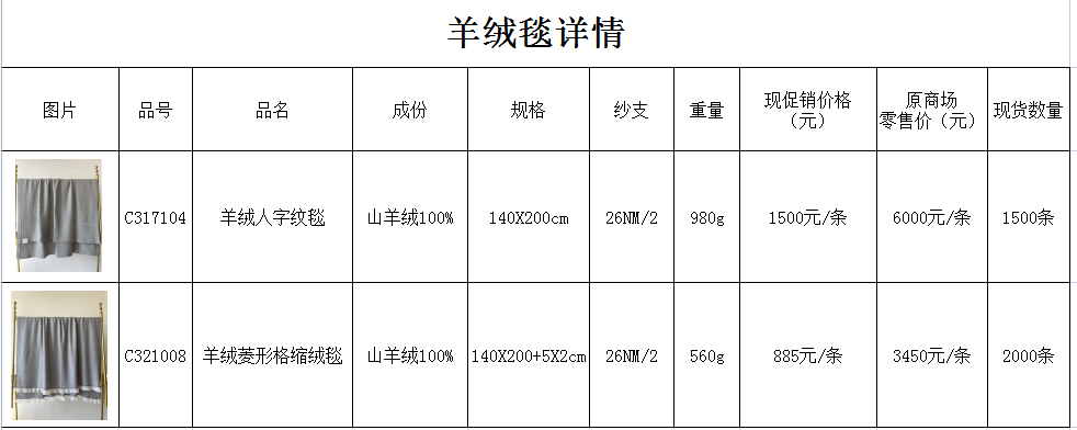 現(xiàn)有協(xié)會(huì)副會(huì)長(zhǎng)單位內(nèi)蒙古大盛業(yè)羊絨制品有限公司生產(chǎn)的羊絨人字紋毯1500條,羊絨菱形格縮絨毯2000條,春節(jié)特價(jià)大酬賓,具體規(guī)格如下圖:
