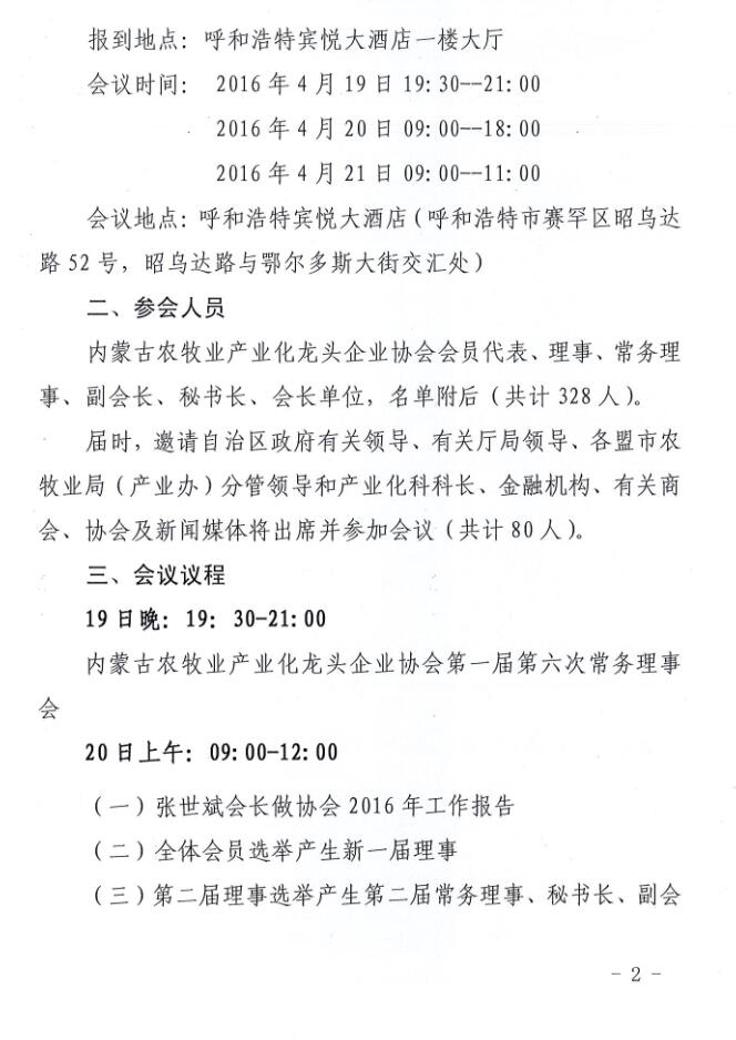 關(guān)于召開(kāi)內(nèi)蒙古農(nóng)牧業(yè)產(chǎn)業(yè)化龍頭企業(yè)協(xié)會(huì)第二屆第一次理事會(huì)暨會(huì)員代表大會(huì)的通知