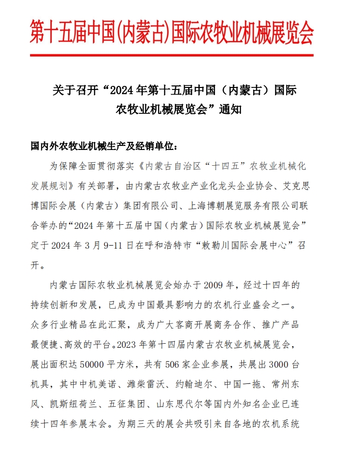 關(guān)于召開“2024年第十五屆中國(內(nèi)蒙古)國際農(nóng)牧業(yè)機(jī)械展覽會”通知