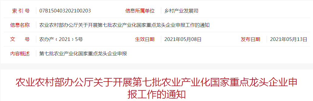 標(biāo)題:農(nóng)業(yè)農(nóng)村部辦公廳關(guān)于開(kāi)展第七批農(nóng)業(yè)產(chǎn)業(yè)化國(guó)家重點(diǎn)龍頭企業(yè)申報(bào)工作的通知