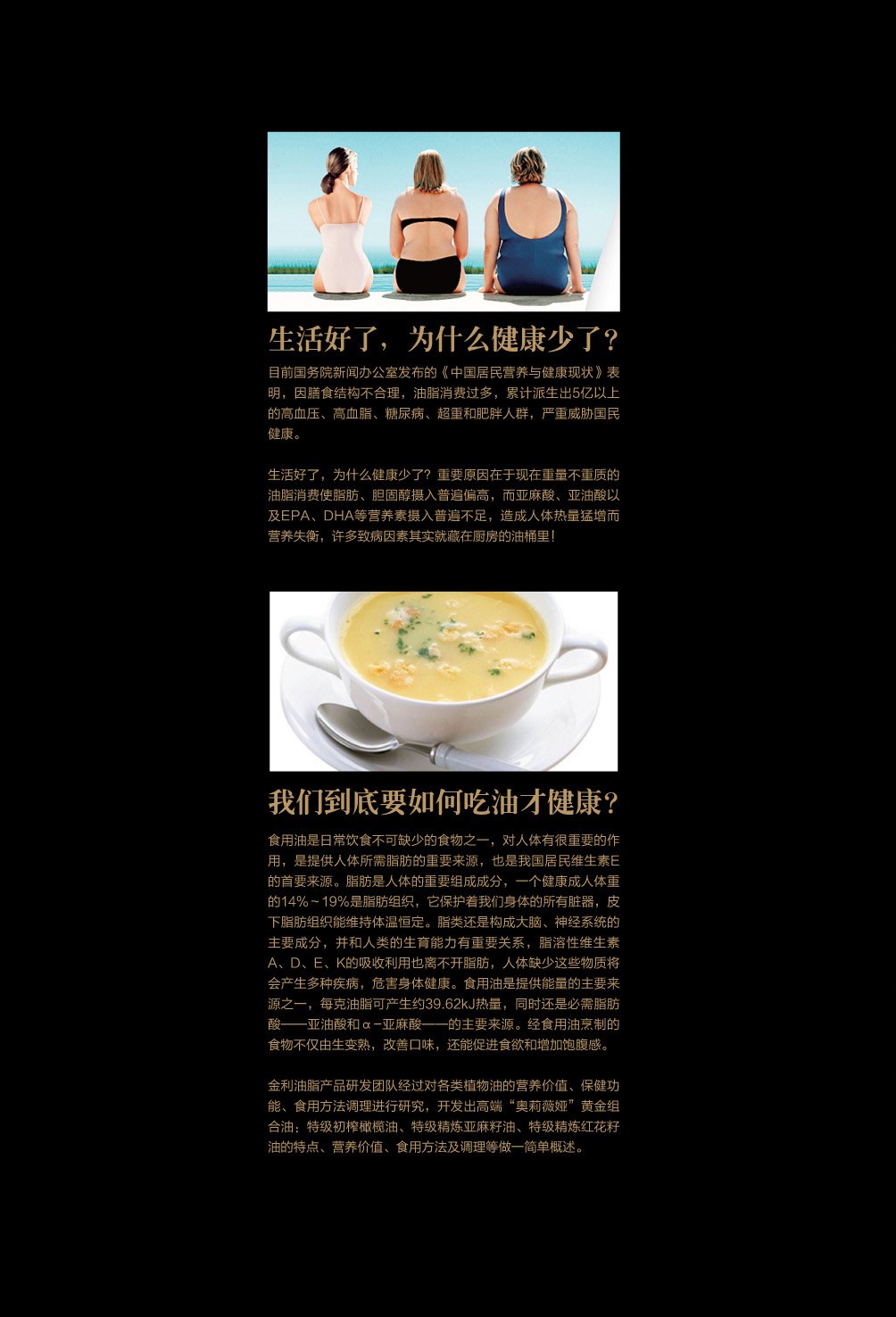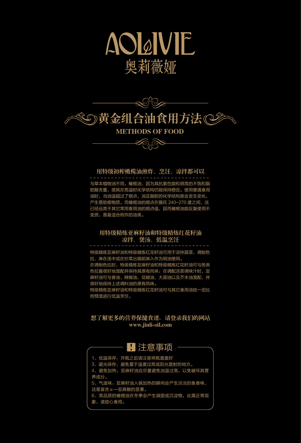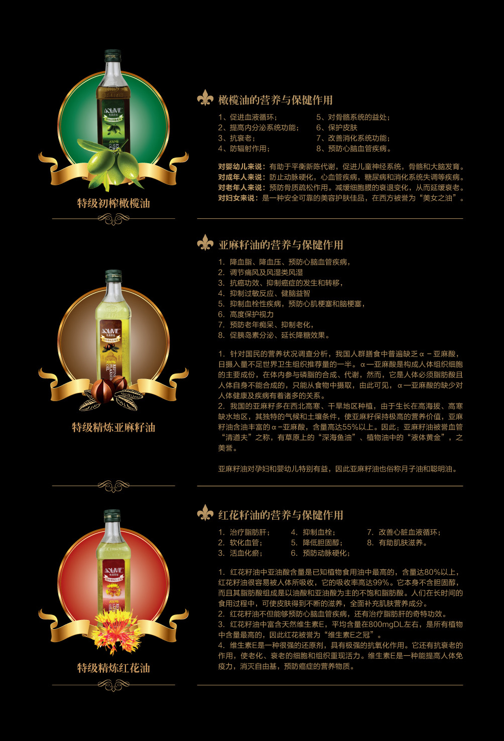 金利油脂(蘇州)有限公司研發(fā)的:“奧莉薇婭黃金組合植物營養(yǎng)油,有各具特色的脂肪酸植物油組合而成,將各種油品進(jìn)行優(yōu)勢互補(bǔ),科學(xué)的根據(jù)人體營養(yǎng)需求,精心研制出的高端油脂系列產(chǎn)品。具有促進(jìn)大腦發(fā)育/增強(qiáng)視力/降脂/降血壓/抗血栓/保護(hù)前列腺/促進(jìn)脂肪代謝/抗衰老等良好的保健作用。為您均衡營養(yǎng)/增強(qiáng)體質(zhì)而“加油”。“奧莉薇婭黃金組合油,是有特級(jí)初榨橄欖油/特級(jí)冷榨亞麻籽油/特級(jí)精煉紅花籽油三種油品組成,其中單不飽和脂肪酸/α—亞麻酸和亞油酸,是所有植物油中含量最高植物營養(yǎng)油。