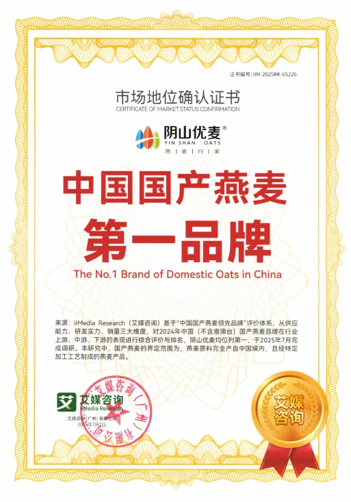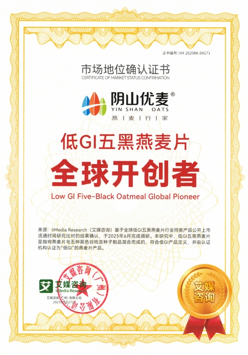2025年7月,內(nèi)蒙古陰山優(yōu)麥?zhǔn)称酚邢薰精@得權(quán)威咨詢機(jī)構(gòu)艾媒咨詢(iiMedia Research)頒發(fā)的“全球裸燕麥第一品牌”與“中國(guó)國(guó)產(chǎn)燕麥第一品牌”市場(chǎng)地位確認(rèn)證書。同時(shí),其創(chuàng)新產(chǎn)品“低GI五黑燕麥片”亦被權(quán)威認(rèn)證為全球開創(chuàng)者,標(biāo)志著陰山優(yōu)麥在全球燕麥行業(yè)取得突破性成果。